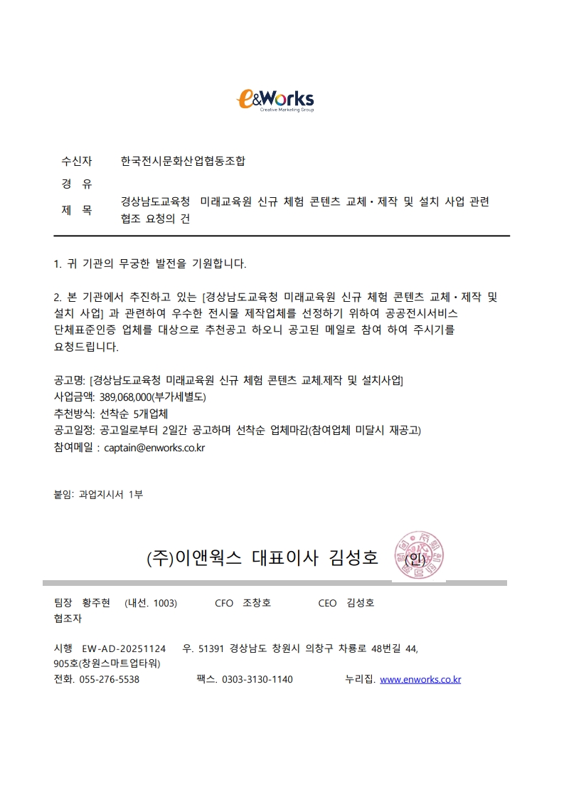 경상남도교육청 미래교육원 신규 체험 콘텐츠 교체·제작 및 설치 사업관련 협조요청의 건